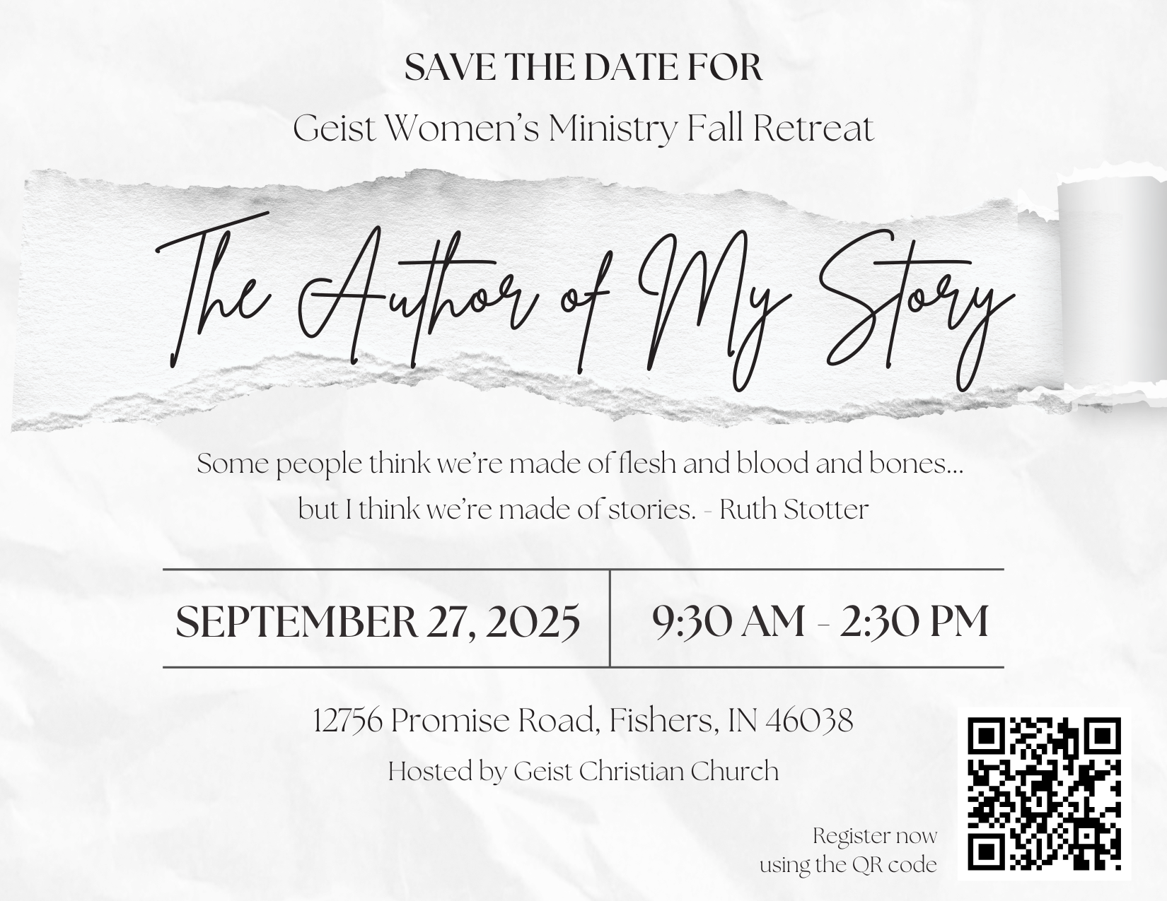 Join us for Geist Christian Church’s third annual Women’s Retreat—a day of worship, music, laughter, and connection. This year’s theme invites you to explore the power of your story, with inspiring speakers sharing personal journeys and encouraging you on yours. Together, we’ll reflect on how God, the author of our lives, shapes each chapter. Come be refreshed, inspired, and reminded that your story matters.